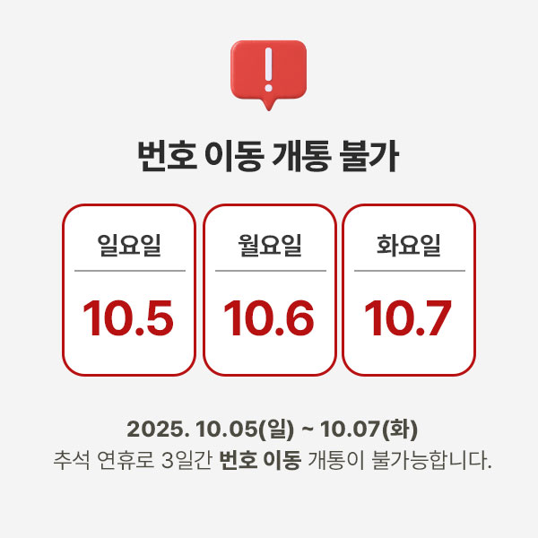 25.10.05(일)~10.7(화) 번호 이동 개통 불가 안내